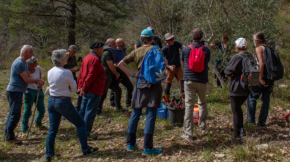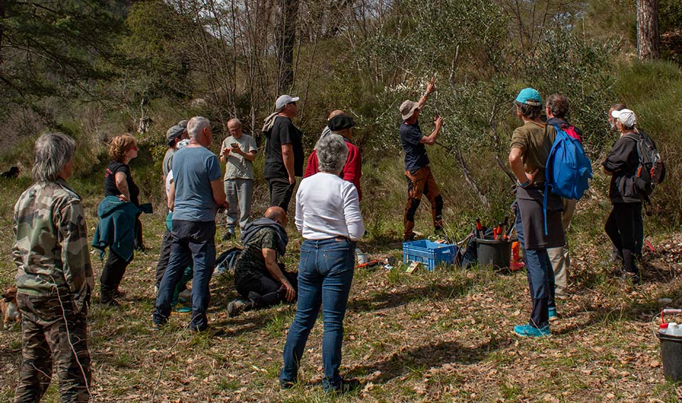 Formation à la taille de production de l'olivier et amendements. Cette formation d'une demi-journée, initiée par la CASA et suivie par une vingtaine de personnes a eu lieu près de Sainte Pétronille.