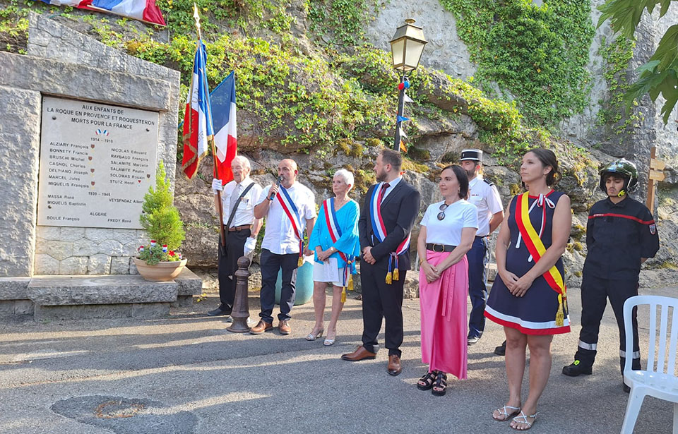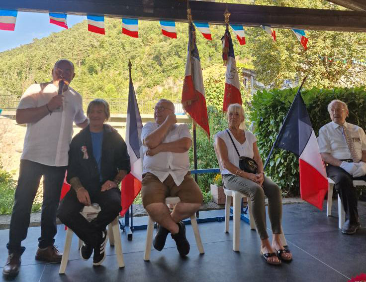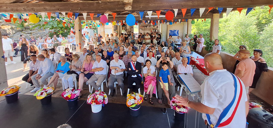 Fête patronale et fête nationale ! Après la cérémonie au monument aux morts, discours du Maire, Alexis ARGENTI. 26 maires présents certains accompagnés par leurs adjoints ou conseillers, une sénatrice, un député, une conseillère régionale, gendarmes et pompiers et bien sûr notre légendaire porte-drapeau Christian LALOT !